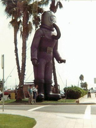 Breakfast was in a Hawaiian restaurant just down the road from the hotel, one with as tasteless an exterior as all the other places on Harbor Boulevard, and the food was good, if expensive. I chatted to Spike and Stu over hash and eggs, a breakfast that seemed suitably American, inconsequential stuff about absent friends that was punctuated by Spike's frequent, infectious laughter. At one point she berated me about the photo of me in the Programme Book (which I'd got at a photo-booth and mailed in just under deadline - see Chapter 1) complaining that she'd hardly recognised me from it and that I was better-looking in real life. But then everyone is better-looking in real life. On the way back we stopped in the hotel car park so that I could take a photo of my companions next to Terl the Psychlo who stood a good thirty five feet tall, his head brushing the fronds of the adjacent palm trees. This amazing figure was actually a large inflatable, one connected by umbilical cord to a van-mounted compressor. The van and compressor were manned throughout the weekend by a cadre of scientologists/ Bridge Publications employees who were there to ensure that this character from their mentor L.Ron Hubbard's BATTLEFIELD EARTH didn't suffer any undignified sagging due to gradual deflation. I laughed at this ludicrous spectacle, secure in the knowledge that the Hubbardites were unlikely ever to get involved in any British conventions.