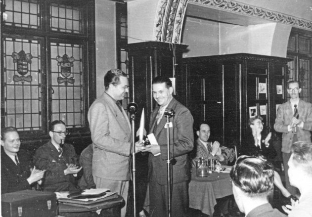 The piece-de-resistance of the entire Convention followed immediately after the international session. Unheralded and unannounced up to Convention time, and known only to a limited few, the 1951 International Fantasy Award was sprung upon an enthusiastic audience, who thundered applause and agreement at the decision of the London Circle to devise and present the equivalent of an “Oscar” to the author of the adjudged best fiction book of 1950 and one to the best technical book in the field.