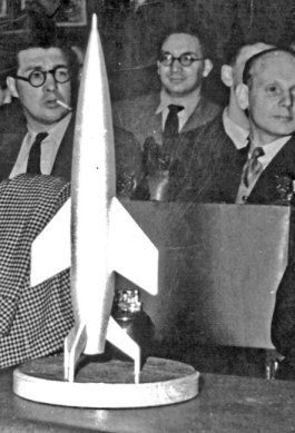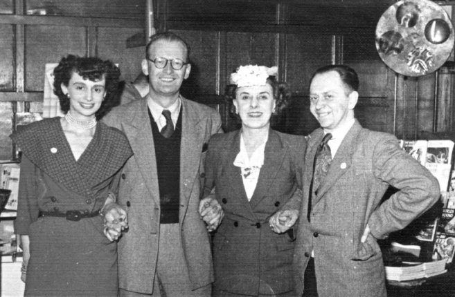 WILLIS: A discussion followed, centring mainly around two points, one as to how many fans were scientific workers or vice versa, and the other as to how many of them were women. On the first, Clarke said that he used to send copies of aSF for circulation among the people at Harwell Atomic Laboratory, and he never got any of them back. Since this is the normal experience of lending magazines, the point seemed rather inconclusive. It was finally decided that some scientific workers were fans and some were not. On the second point, Forry thought that the number of fem-fans was increasing. He instanced the proposed Star Science Fiction, a mag that would have been aimed at women if someone hadn't dropped it. Derek Pickles stood up and deftly inserted a neat little plug for N3F, giving statistics of how many members had been found on superficial investigation to be female. Incidentally, this seems a good place to mention that not only were there quite a crowd of fem-fans there, but that the standard of looks was very high. Apart from my own wife and Alan Hunter's, there was a chap called Robert Conquest (a well-known poet who recently managed to get into The Listener, the BBC's literary review, a really excellent poem plugging sf) who had a really stunning wife with him [Tatiana Mihailova]. Not only was she extremely attractive but she was a Bulgarian, which Alan and I thought wasn't quite fair. And of course there was Audrey Lovett. She is attached to the London Circle, and they are crazy about her, too.