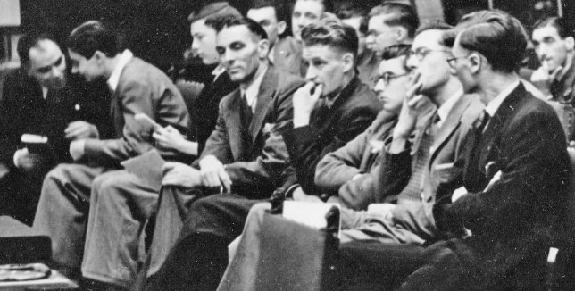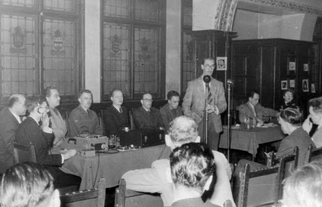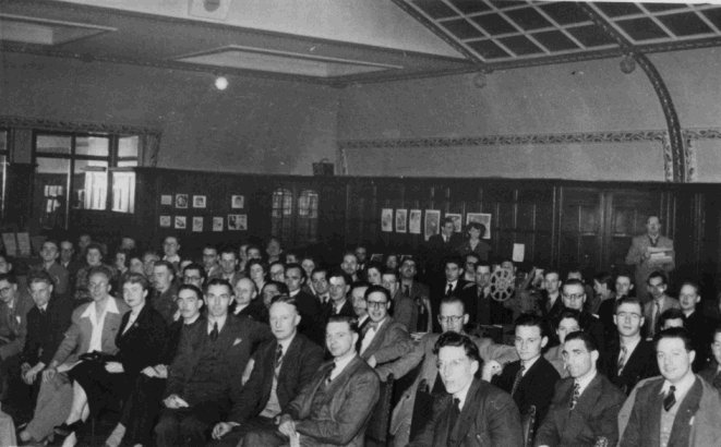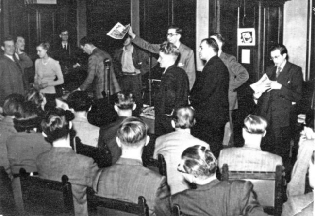 Lyell Crane then closed the discussion. He got up and solemnly announced that he had changed his mind. The audience silently approved this decision, but didn't notice any appreciable difference. He also said he learned a lot from the proceedings but he didn't say just what. Finally he gave his name and address very slowly and clearly for the benefit of the wire recording, which happened ungratefully to be out of action at that point. It was an interesting tableau: the recording engineer desperately trying to insert a new spool, and Lyell speaking very deliberately and obviously wondering what the audience was gesturing about. Eventually Lyell tumbled to what was going on, and contented himself with hanging up a notice. I'm sorry, by the way, if I have seemed a bit sarcastic about Crane. He is a worthy chap, but just a little inclined to take himself and fandom a bit too seriously.