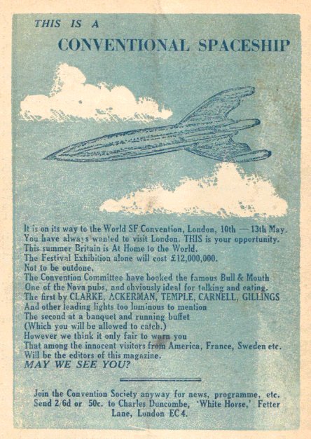 This ad for the convention appeared on the back cover of SLANT #5 (Spr '51), the Irish Fandom fanzine produced by Editor Walt Willis, Art Editor James White and Associate Editor Bob Shaw.