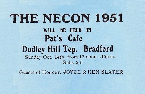 We did not start off with any definite idea of holding a Convention as such, but merely a meeting for local fandom where they could meet, in company, Capt and Mrs K.F. Slater, who were visiting us for a few days. However the idea snowballed, and with remarkably little effort promises to attend were arriving from people as far apart as Liverpool and Newcastle, Lancaster and Grimsby. Over 150 leaflets