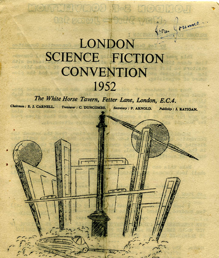 PROGRAMME BOOKThis cover looks to be the result of wanting to use up the con's remaining sheets of headed notepaper. However, it appears they ran out of these because clicking on 'NEXT' below will take you to an alternate version of the cover, with the artwork seemingly traced on stencil from this original.