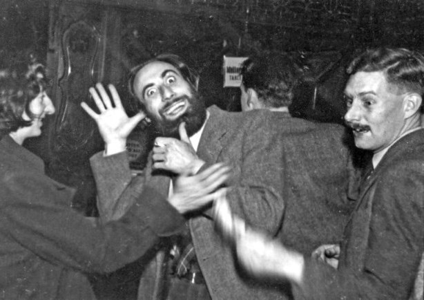 ROBINSON: Almost every fan you can think of (and I can't) was present that evening and the Londoners gave a demonstration of a game of great skill and cunning, not to say strength, that they have invented - called Order a Drink at the Bar. I'm told that the local champion is Ted Carnell whose favourite play is to scatter free copies of New Worlds around the tables and then while the Circleites rush to spill beer on them he dashes to the bar and orders. Another champion at this game is Bill Temple who employs a different system. He comes first, leaves last and stays doggedly at the bar at all times between. There is a hollow in the bar at the point where he stays which came about when Galaxy folded and there was a great depression in the bar; as a matter of fact a notice is to be erected over this end of the bar bearing the legend "Bill Temple wept here"! This has a link with a rather old convention custom when all the fans get together to bury the hatchet and cry into the beer. However, to continue, having frightened the life out of several fans with the flash gun (they'd evidently read Campbell's 'Chaos in Miniature' and remembering what he said about the appearance of the 'Shrink Ray' and about Welshmen, they put two and two together and fortified themselves with a couple of pints). I met Walt Willis and Vince Clarke again and Walt pointed out a tall character rather sheepishly holding a STRONG DRINK as James White. I had realised this already of course because of his Blanco expression. On enquiry James explained that he was holding it for someone but when I casually enquired about the Bulmer van he had to be forcibly restrained from swallowing it (the drink, not the van). I hear that the London Circle are thinking of erecting a plaque on the stairs with the inscription James White Drank Here or alternatively that the White Horse is to be renamed The Dark Horse. A word would not be amiss here about Lou Mordecai who is so very much more than a barman - a trade at which he is nevertheless very skilled. Lou has the angelic expression usually associated with Sunday school pastors. However, to hear some of his jokes would convince anyone that he is in reality a retired sailor. I'm told that Lou (who invariably smokes pungent cigars) while not spurning science-fiction, is wont to give one of his smiles and turn to Dostoyevsky.