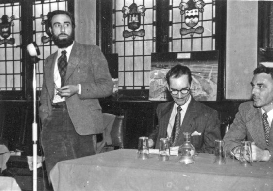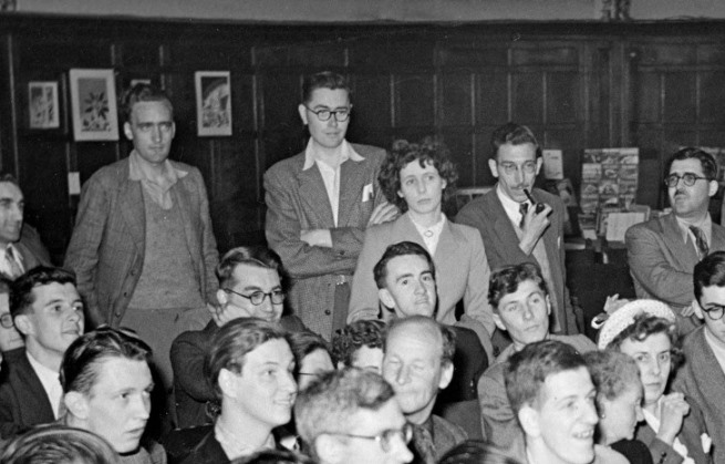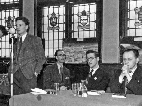 WILLIS: After lunch there was another forum by various authors and artists, including Ted Tubb, Brian Berry, Dave McIlwain (author of an excellent sf play recently broadcast by the BBC), Dan Morgan, Bert Campbell, Alan Hunter, Syd Bounds, fluent Frank Edward Arnold, and other vile pros. I thought Bert Campbell made the best speech, but Bounds read a thoughtful and intelligent paper about where he thought the future of sf lay, throwing in a plot synopsis of "The Green Hills of Earth" only slightly longer than the story itself. After the invited pros had said their pieces John Brunner got up and came to the dais where, as Britain's most up and coming young author, he made a competent and interesting little speech. I envy him his self assurance: also the 600 odd dollars he's just got for a 21,000 word novelette sold to Astounding. Next Les Flood introduced the International Fantasy Award, including among his descriptions of the judges one of me as the leader of 'articulate fandom.' This was the best joke of the Con, but nobody laughed.
