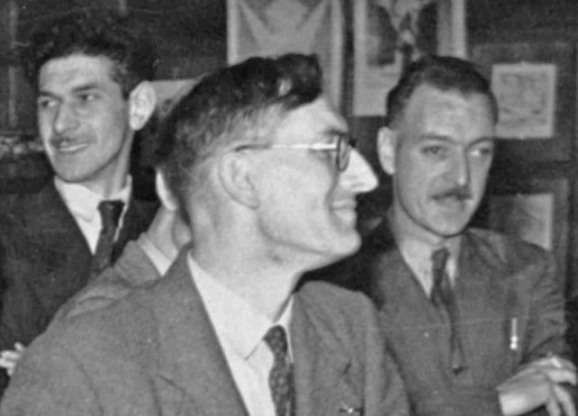 ROBINSON: Before we realised it the convention was all over, the last fans were saying goodbye and all that was left was an empty hall liberally strewn with chairs at all angles, odd bits of paper, and a lot of memories. By virtue of the fact that he held the door open for me, James White had the honour of being the last to leave. Vince, James, Walt and I wandered seemingly miles through London that night talking over the con, future plans, con-reports, and Walt's (then) impending Stateside visit [ see free Ansible ebook THE HARP STATESIDE]. Finally we split up, and it was all over for another year. I can do no better than quote Vince's comment on the con - "Conventional". It lacked life, novelty, sparkle and organisation. If London is to do better next year they had better start planning now. Where was Walter Gillings? Why didn't Bill Temple or Peter Phillips speak although they were present? Why weren't the recordings of Denis Wheatley's book and the San Diego con given, as promised in the programme? Why didn't the billed French film turn up? Why no playlet by the S-F Soap Opera Company as forecast? With the possibility of many overseas visitors coming to Britain next year I hope that the committee will make a point of getting things organised and things like recordings tried out before hand. Let's have another super con as we had in 1951 - The Con-oration! CLARKE: That ended the Convention proper, altho' a small party went to find a showing of FLIGHT TO MARS on Monday, and that afternoon saw the first meeting of Walt and James with Chuck Harris, who had been unable to attend during the weekend.