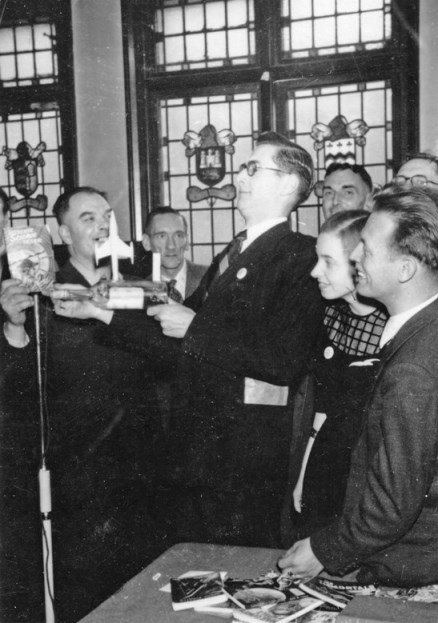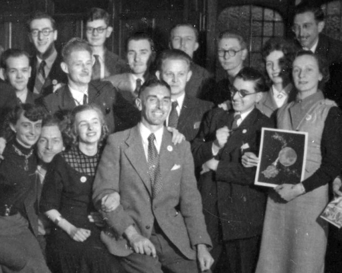Terry Jeeves of Sheffield had now joined us at the Avondale, and on Sunday morning the five of us met in conference, to compose a speech. Object of said speech: to convince the fannlsh morons that the ideal site for the 1953 Convention would be Manchester. Being all northerners the only problem for us was to compress all the multitudinous virtues of Manchester and countless arguments on the subject into a five-minute summary. Back at the Con that morning, there was of course another informal talking-and-tradIng session. We discovered that the SUNDAY PICTORIAL had given the previous day's events a write-up of about four column-inches. As far as I know that was the only newspaper to mention the Convention, although the DAILY HERALD sent a photographer. Fred Robinson was probably the busiest- camera-man there; he covered the NSFC table with about two square feet of defunct flash-bulbs.