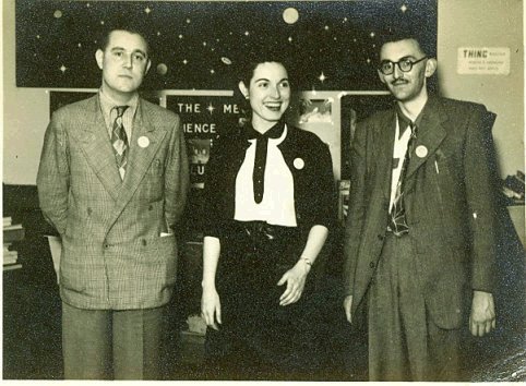 WALT WILLIS (in OOPSLA!): The only organized hoax put through by the London Circle was one that hadn't been part of "Operation Armageddon" at all. Stuart Mackenzie's wife, Connie, was not coming up from London until the night of the first day, and they conceived the idea of passing her off as Pat Mahaffey [sister of Bea], an unexpected visitor from the States. A pre-arranged telegram was sent from London signed 'Pat', giving the time of her arrival, and throughout the afternoon the London Circle made great play of concealing the news, discussing it just within earshot of Northerners and then looking furtively around and moving away. Later on they 'carelessly' left the telegram laying around where Dave Cohen, Convention Chairman, could find it. Dave indignantly taxed them with it and they made a clean breast of it. Yes, Pat Mahaffey was coming tonight. They'd meant to keep it for a surprise, but now that Dave had been smart enough to find out he was cordially invited to join the welcoming committee. At ten o'clock the welcomers - Dave Cohen, Stuart Mackenzie, Ted Carnell and me - went down to the station. Dave took us there by taxi. At the platform barrier Stu nudged me when his wife appeared and I went forward and greeted her, asking after Bea and recalling old times in Chicago. Dave had the taximan drive us a roundabout way back to the hotel so 'Pat' could have a look at England, and Ted and I talked to her about Bob Tucker and Robert Bloch and the rest of our mutual friends, Connie was heavily made up, chewed gum incessantly, had a TWA label on her bag, and handed round a pack of Chesterfields. Her accent was from Brooklyn, if anywhere, rather than Cincinatti, but it was quite good enough for Dave. At the hotel he introduced her to the other Northern fans, some of whom have since written her up in their convention reports. But the most complete victim of the hoax was, curiously enough, a London fan called Ron Deacon. He had never met Stu's wife and fell for the hoax completely. In fact he fell for 'Pat' herself and, perhaps encouraged by the remarkable progress Stuart Mackenzie had seemed to make with her, started a campaign to try and date her. This went on with letters and phone calls and other advances weeks after they all got back to London, while Ron thought 'Pat' was a guest at Stu's house. Finally Stu got tired of seeing Deacon trying to seduce his wife under his nose and broke the news to him as gently as possible. Altogether it was a remarkable hoax, and one that deserves to go down in fannish history.