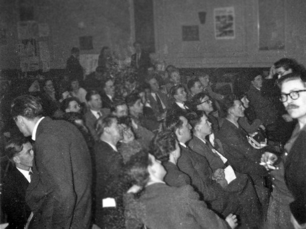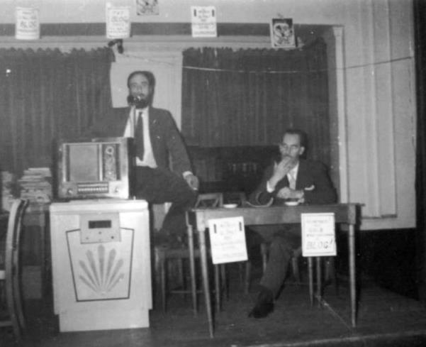 WILLIS: The Liverpool Group's famous tapera ... was so good that the sensitive fannish audience sub-consciously realised that anything else, even Ken Slater lecturing with laryngitis, would be an anticlimax. They voted for an interval with their feet, leaving a publisher who had begged a five minute spot in the Programme for a plug with the task of selling his spring list to 120 chairs. (My brain received a message from the rear what they could do with them.)