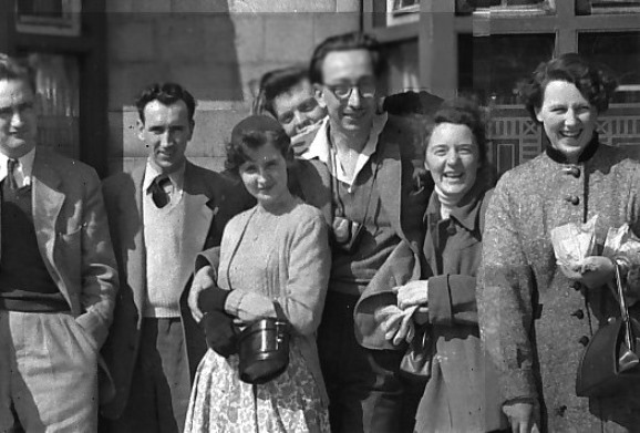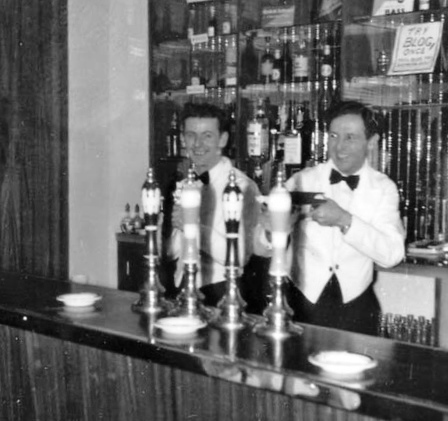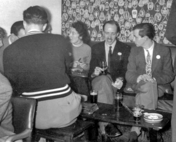 ALLEN: Downstairs fen were gathering in various places waiting for one of the big rooms, which the manager said we could have until seven the next morning, to be opened. The manager was also going around telling folk that if they were not a resident of the hotel then they could not stay, but of course nobody present was a non-resident so everything was alright.....but I still wonder why it was that he picked on me to ask what room I was staying in out of the couple of dozen fen that were present when he made this announcement. The party-room was opened up at ten and it was not long before it was full, so full that I couldn't find a place to sit except for the floor which was undoubtedly the best place to be - I wouldn't have far to fall! A bar had been erected at one end of the room and they were doing-a roaring trade. Shirley (Shamey) Marriott said she was going to get me drunk if it was the last thing she did and went off to the bar to get some booze. When she returned we sat at a table along with Paul Hammett, Meredith Chatterton, Ethel Lindsay, Ron Buckmaster and Pete Taylor.
