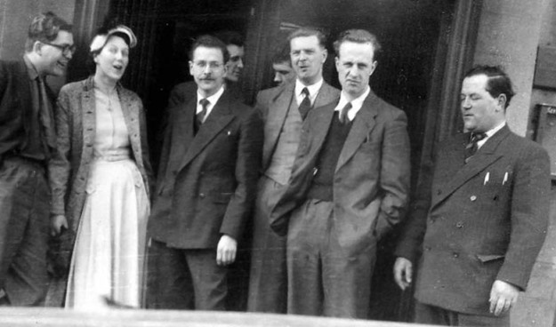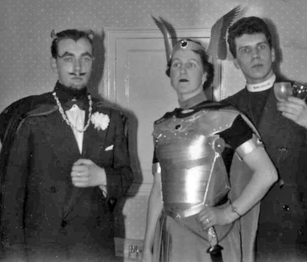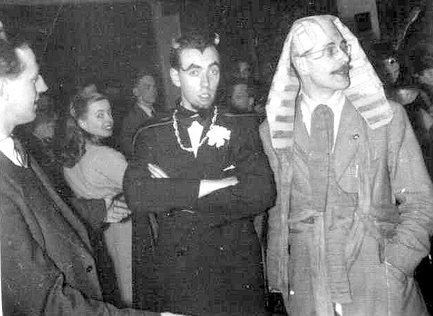 The Liverpool group had decided to make theirs a fancy dress party and had come in costume. This was where costuming first truly started at British cons and some of those costumes were of a quality that wouldn't be matched again - other than by the Liverpool group - for many years. HARRIS: Our first stop was in Room 101 - a single bedroom with more than thirty people packed into it.... fifteen of them sitting on the tiny bed and the rest squeezed in around the walls. Bert Campbell, crammed alongside the washbasin at the far end, was pouring out drinks for anyone who came within range, and everybody was doing their best to keep him fully occupied. Even now, it's still mercifully hazy, but I can remember finding Eric Jones with a tumbler full of hock in one hand and an "Introduction to Elementary Psychology" in the other, and then squeezing past him to find Ina Shorrock sitting on the bed. Last year, dressing sensibly for the Mancunian weather, Ina wore a bathing suit to the Liverpool party, but this year she was much more cautious, and was dressed as a Viking in a winged helmet and a shiny metal corselet. I found a tin opener attachment on the corkscrew and moved in. It was blunt though.... and anyway, Bert wanted it back to open another