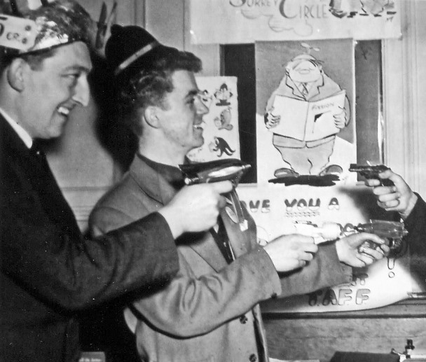 So Vin¢ Clarke was just in time with the zapgun licenses he was selling at CYTRICON to raise momey for TAFF There was some speculation next morning as to what would take its place. Ken Slater was demonstrating a potato gun, but one hates to think of what fannish ingenuity might develop from this. Bombs loaded with cold mashed potatoes, bazookas firing half a stone at a time, french fried shrapnel, long range rocket missiles... maybe even guided potatoes, with electronic eyes. A horrible thought. Mal Ashworth and Ken Bulmer came up with the best idea -- a double-barreled shotgun with one barrel loaded with tar and the other with feathers. It could be used for running people out of fandom.... such as thoughtless zappers. After the film show a number of us had a very pleasant party in the Residents' Lounge...or at least I enjoyed it. Not too many people, only one talking at once, and everyone participating. Arthur was drawing cartoons, as usual - his graphic commentaries were one of the best features of the Convention, and became a sort of illustrated quotecard -- and Pamela stole a particularly brilliant one for UGH [her OMPAzine], hiding it down the neck of her dress. ("She's wearing a strapless evening cartoon.") ALLEN: Shamey and I got sick of the film, as did a few others, so we left the hotel to go on a sight seeing tour of Kettering. I must say that the fresh air freshened me up a lot and on returning to the hotel I felt just in the right mood for fun. Shamey agreed to coming up to Ron's room to help with BURP! I did manage to drag myself to help with the printing and just as I was halfway through cutting a cartoon Mike Wallace cried, "Good Ghod, it's time we were going, the party will be on soon!" Mass exit, of all but me, I had to finish the cartoon and then change into my party-shirt which is one of those American style-beach-shirts all bobby dazzly colours (Though mine was a little on the dull side!!).
