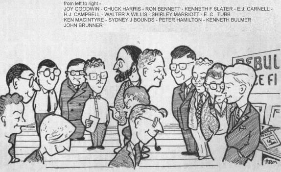 Soon afterwards Sheila made a private presentation to me. I was elected "Fan Of The Year (1866)" by "The Bradford Society For The Care And Feeding Of Elderly Sex-Fiends" and was given a mint copy of "Dimension of Illion" - the very latest ninepennyworth in the Tit-Bits Science-Fiction Library. I was hoping that Mal would be carried away by the occasion and present me with Sheila herself, but he seemed unenthusiastic about the idea even though I offered him three part-worn paramours and a free sub to HYPHEN in exchange. The next bit of the official programme was the tape-recorded play of the Liverpool Group - THE MARCH OF SLIME!.....a commercial broadcast sponsored by the makers of BLOG. Dave Newman and Norm and Ina Shorrock lent me the only copy of the script afterwards [Chuck being deaf]. It's wonderful, superbly fannish stuff and I would have loved to have been able to publish it myself, but Eric Bentcliffe got there before I did and it will be coming up in TRIODE shortly. For me, the highspot of the play was the "entry of Willis into the Convention Hall ".... "a fanfare heralds the Maestro... .he waves a hand in greeting as the people bow and curtsey.. .and Bert Campbell steps on his own beard and topples over." I told Walt afterwards that it wasn't a genuineflection - it was just a false salaam... but somehow he didn't really appreciate me.