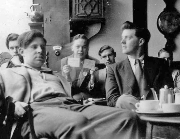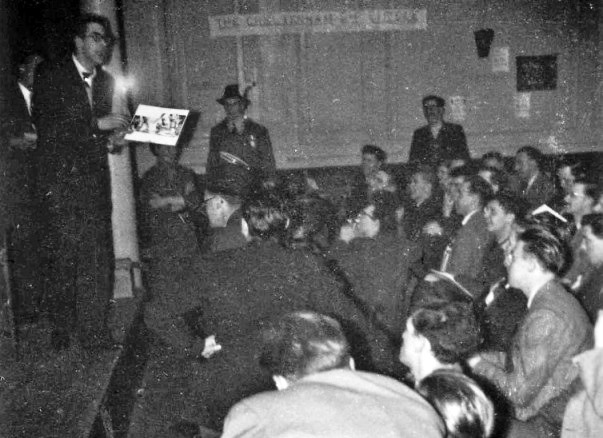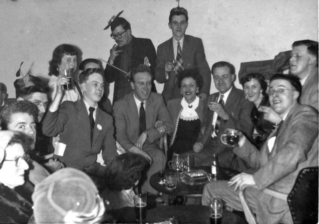 Monday 11th AprilDownstairs at 5.30 Boris made me a nice breakfast which I ate in the deathly quiet Devils Kitchen lounge. Boris told me that everyone on the staff were very pleased with the convention and that fans were the friendliest nicest and most generous people he's ever met. This was the egoboo I collected on behalf of fandom. Before leaving the hotel I saw Wansborough who was wandering around the hotel obviously gathering inspiration for his next poem. I bid him farewell and left, feeling depressed and sad that such a wonderful weekend had come to an end.Ten minutes later I was back. My train had been cancelled and the next one was not due until 10 am. I was glad I could stay in the hotel for a few more hours. I collected my keys from Boris and on my way to my room I met Marriott. She had been locked out of her room so I invited her in to mine. We stayed there until eight, talking of fannish things, and came down for breakfast, my second. Most folk were surprised to see me still around. I was surprised myself. After the morning grub I sat in the now noisy Devils Kitchen with Archie, Shirley and a few others until ten. This time I really left, accompanied by Terry Jeeves, Ron Bennett and Irene Boothroyd on the train back. However, on our way to the station there were Marriott, Oosterbaan, Harry Clements, and one or two others dotted up and down the road. We bid our farewells, took a few photographs and then Terry and I went into the station. Just then, as most fen were leaving, a strange thing happened, the 'all-clear.' sirens echoed over the countryside! "Well of all the cheeky blighters!" gasped Terry as our train pulled out of the station, "Fancy that!"