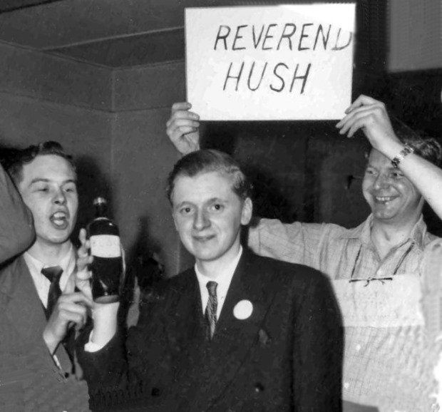 At ten the bar shut and everyone drifted upstairs to the residents lounge for the second all-night-party. I madly dashed up to my room to put a soaking wet pound-note on the radiator to dry (my zap gun had burst in my pocket) and then, once more, madly dashed into the Residents Lounge. The whole hotel was here, with the exception of Walt & Madeleine Willis, Bert Campbell, Ted Carnell and Ted Tubb who had left for home at 5pm. At these all-night parties the management kindly supplied us with an all-night waiter, and wow, what a waiter, he looked like something out of a horror comic. Mebbe he was a fugitive! But, for all his gruesome looks he was a very nice man! I nearly laughed myself to death when he got his own zap gun and drenched Shamey's blouse. Towards midnight we were invaded by another Yank, this one was a photographer called Shaver, (a real mystery) who wanted some pics of the fen! He brought with him some canned bheer which made him, naturally, very welcome. [The other, Dick Zaremba, was a non-fan who had been spotted at the bar. According to Shirley Marriott: "One young fan roped in an American who was looking very lonely, and he told us afterwards that he had not enjoyed himself so much since he left the States, which was nearly two years ago!"] Mal Ashworth & Sheila entered the room and the two love birds headed straight for one of the sofas. I hadn't seen much of Mal over the weekend, (who had?) so I decided that this was my best opportunity for a bit of talk. So we talked, but they were not present for long, soon they were wishing everyone goodnight, I said goodbye explaining that that I was leaving on the six am train. When they had gone I heard femme-type-squeals from behind me, I turned just in time to see Shamey being dragged off by Ron Buckmaster to a party which was being held in room 10. The lounge was now almost empty but for a group in a corner playing cards and an odd bod here and there. I hailed Archie and we too went off to room 10. On opening the door we were confronted by a solid wall of fen, the 12' x 12' room was crammed tight, and cigarette smoke belched out the door like smoke from a wood fire. Archie and I bulldozered our way in, Archie forced one way and me the other. Eventually I found an empty piece of floor in a corner between the bed and the wardrobe. (I think Burgess was in the wardrobe!) When I had recovered my strength and adjusted my eyes to the fog-like atmosphere I looked around to see where Archie had got himself to. Eric Bentcliffe was standing beside me and was furiously taking down notes on toilet paper (said he was going to decipher them at his own convenience!)