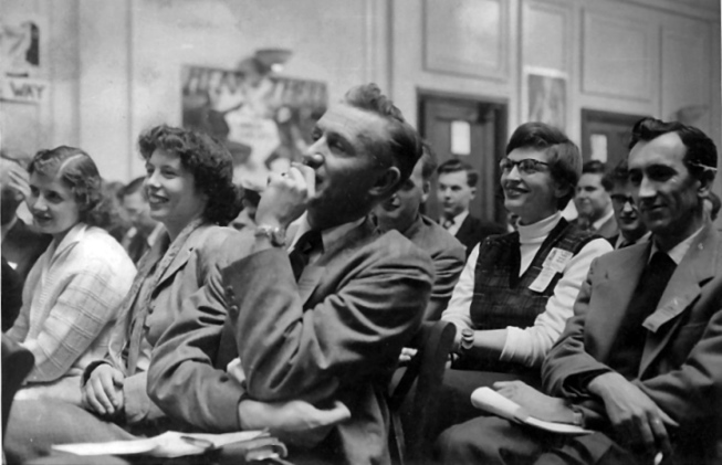 One bit of it I do remember was Dave Kyle's outline of the plans for the New York World Convention. His listing of all the committees and sub-committees they had lined up for this affair caused me great doubts as to whether we should have enough fans in Britain to have one on each of these committees if London got the Worldcon in '57 (which, as you know, it did). Things like the all-night parties and the programme were the mainstays of the convention, naturally; the frame around which the rest of it was built. But it is the odd little things which I remember most clearly - Peter Reaney, for instance. Er - Peter Reaney's jokes and the jokes made to and about Peter Reaney, I mean. And remarks like Chuck Harris's "I said I was an Es-sex fiend, I didn't say anything about giving it up", and Ellis Mills's "You have to be in bed by 7am to get your early morning tea", Ken Potter's "middle-aged sandwich spread" and Irene Gore's "You wouldn't want me to get sober, would you?". Those are the parts of the convention I still remember; and added to the fact that I can't remember much more they seem to indicate that the whole thing was pretty terrific.
