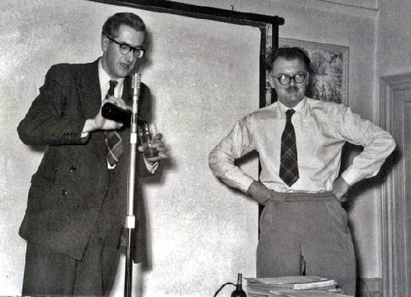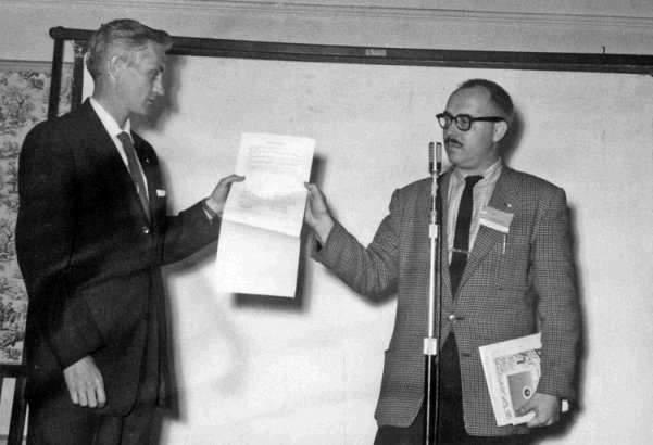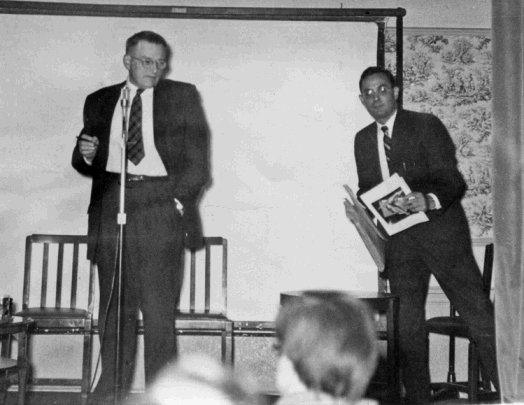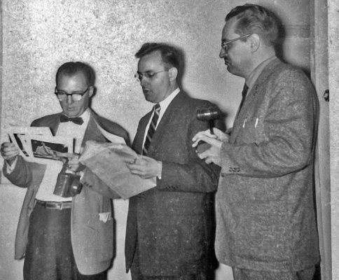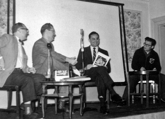 After lunch, 4e, SaM, and Bob Madle put on a little quiz show of their own. It was a three-cornered contest with each of them out for blood, and deliberately making the questions as hard as they could think up. Truly, it staggered me at the way they did find the answers, but it would be unworthy to suggest that it was cooked up beforehand. Anyway, cooked or not, I don't think I shall ever forget Forry rattling off the titles and dates of all the Frankenstein films in sequence, or SaM, carefully and methodically, giving title and place of publication of every Weinbaum story ever written ..... and, after about six minutes, getting down to those that were published in fanzines.