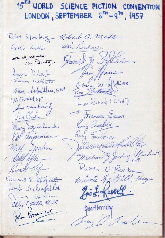 THE AUTOGRAPHSRainer Eisfeld:Rummaging through my fannish treasures, I (re-) discovered another 1957 souvenir, which I am appending for you. During the Worldcon, that slim book was on sale in London bookshops. We had nothing comparable in West Germany, so I bought it immediately and used the inner front page for the fine purpose of garnering the signatures of British and American participants.