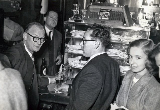 The bar. Sam Moskowitz far left, Bill Temple in bright suit