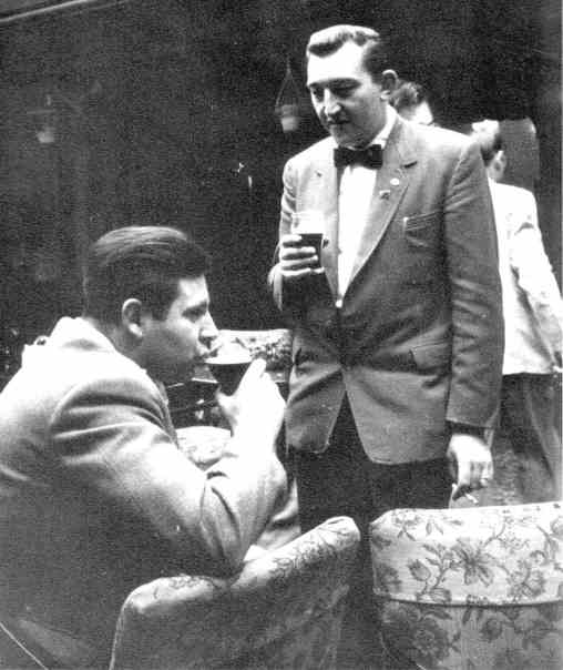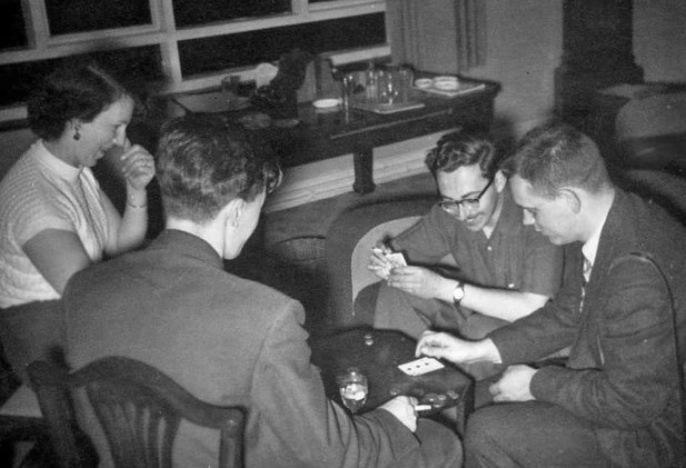 In the Devil's Kitchen (so named for its statue of the devil and assorted infernal devices, including man traps. There is also a weird looking thing that Rusty thought was some terrible instrument of torture. I tried it, and it turned out to be a device for opening the windows) we drank tea and coffee as served at all hours by Bill, the genial waiter. I was also an innocent coat holder in a ferocious duel between Bennett and Shorrock using stamp tweezers as weapons. And so on and so forth. Rusty got tired and so did other people and they drifted off to bed. Being a serious student of games, I was interested in a game called Brag that the English fen play. Ron Bennett and Norman and Ina Shorrock began my education. At first (deuced clever of them) I was an easy winner but this was not to last. Things kept getting worse and worse and when play halted at 4.30 am, I found myself loser to the extent of about twenty-two shillings. Ron Bennett made Brag history by taking in a pot total 4 pounds and 17 shillings on one hand