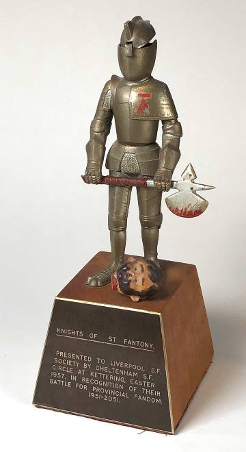 Dave was posted over here at the time, flying nicely primed nuclear bombs around in the skies for SAC. His colleagues were shipped home on a regular basis with nervous breakdowns. He hailed from Florida and had been well-known in fandom under the surname of Howard, the adjustment being made when he joined the Air Force and the authorities insisted on his original name, rather than that under which he'd been brought up after his mother had remarried. This pleased his wife. "Anyone can be called Howard," Rusty said, "but how many people are called Jenrette?" [1] Though not noted by Jenrette, this was the occasion of the first Order of St. Fantony ceremony, which presumably took place at 10pm on Saturday evening. Those knighted during this are as asterisked above.