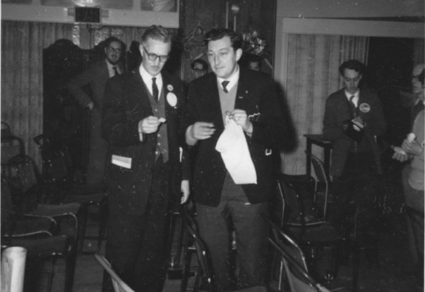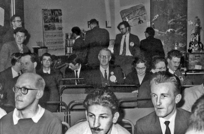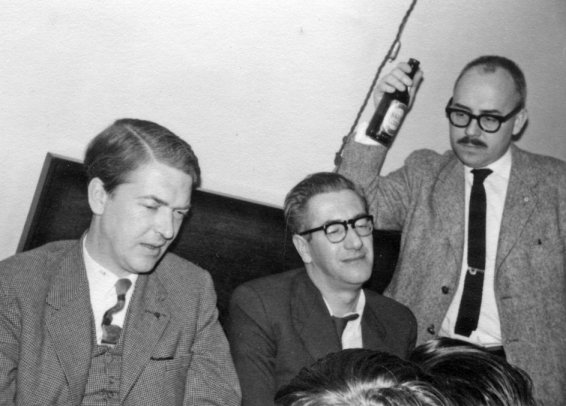 And then there was the Mini-Bathcon. It wasn't called that at the time, but it seems to be as suitable a soubriquet as I can think of for it. The mini-bathcon had already started when I arrived on the scene with flash-bulbs flaring, it was a small select affair with a membership of three. Norman Shorrock, Bruce Burn, and Keith Freeman. I gather that it all started when Norman (or Bruce, or Keith) got a little tired of the crowded atmosphere of one room-party, and decided to seek solitude in a nearby bathroom. He was shortly joined (in the typical lemming-flow of fan movement at conventions) by the other two. Since there was nowhere else to sit, they sat in the bath. Since all three of the gentlemen concerned have a distinct aversion to 'dry' parties, the taps were turned on. At the time I arrived the bath was about a quarter full and Bruce, Norman, and Keith (fully dressed to shoes and socks!), with a contented look on their faces, were happily watching the tide come in.... Convention Guest of Honour, Kingsley Amis, looked in just after I arrived, but declined the cordial invitation to step into the bath and have a chat.