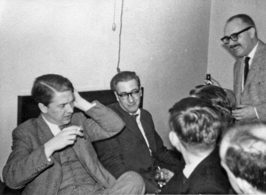 ERIC BENTCLIFFE: I had a fine time at the parties on the Saturday night to Sunday morning shift; Dave & Ruth Kyle had made it and we reminisced a little about Potsdam and Pittsburgh, and said 'My God, is it that long since!' I met Ian McCauley for the first time, and thought this latest ambassador from IF to be an excellent one - he said he'd recognised me immediately, and I wondered if it was from the punched-out silbuette in the Willis attic-wall, the time I played Ghoodminton with John Berry.... From the photos I took I seem to have been to several room-parties that night, and I recall snatches of many amusing conversations. And I wonder what Kingsley Amis was saying in the shot I have of Harry Harrison brandishing a bottle over he and Ted Tubb...
