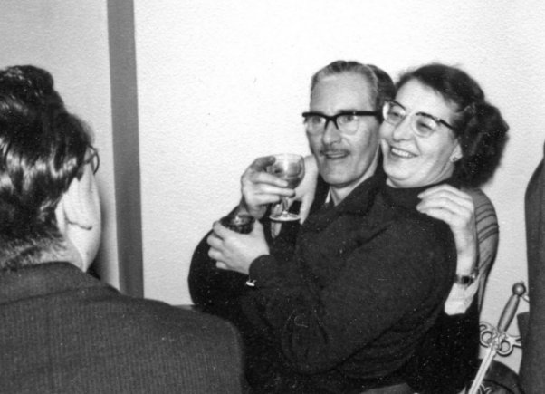 ELLA PARKER: Much later on Saturday night Ethel and I went upstairs to get ready for the company we were expecting to visit our little suite we had to ourselves tucked away in a nice little corner of the hotel. We even had a door which could be shut closing us off entirely from the rest of the hotel any time we felt downright unsociable. Need I say it was never used? The party was held in high good spirits and was an interesting mixture of the faanish and sercon. Here too S-F came in for its share of attention during the jollity. Ethel remarked to me next day of two intriguing conversations, snippets of which she had overheard. To one side they were talking about S-F and on the other there was Phil Rogers and I talking about the fascinating way in which Dave Barber wiggled his ears. This must prove summat, but I don’t know what. We were keeping pretty well open house between the two rooms and as there wasn't room for all of them in Ethel's place the overflow was passing through into mine. This makes it difficult to know who was at ours and who had gone off looking for another party elsewhere. I do remember seeing Phil Rogers, Dave Barber, Don Geldart, Ted Carnell (who had turned up unexpectedly and most welcome he was too), Jimmy Rattigan, Ted Tubb, Ted Forsyth, Joe Patrizio, Alan Rispin and Diane (that name again!), Brian Aldiss, Brian Jordan, Jhim Linwood, Jeff Doherty, Ian McAulay (you could have guessed he’d be there!), two Shorrocks', Kingsley Amis, Ken Slater, Bobbie and Bill Gray, Ron Bennett, Bruce Burn, Daphne Buckmaster, Keith Freeman, Margaret and Eric Jones, and last but not least Arthur Thomson, who had come down for one day and was acting barman very capably. It was a good party.