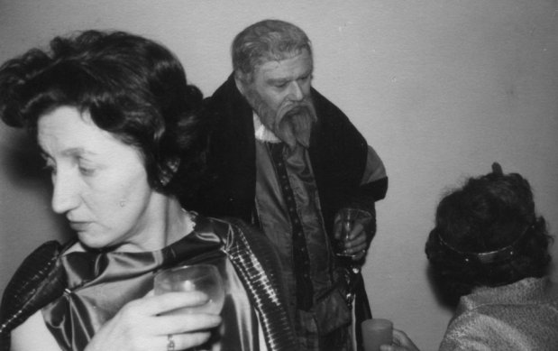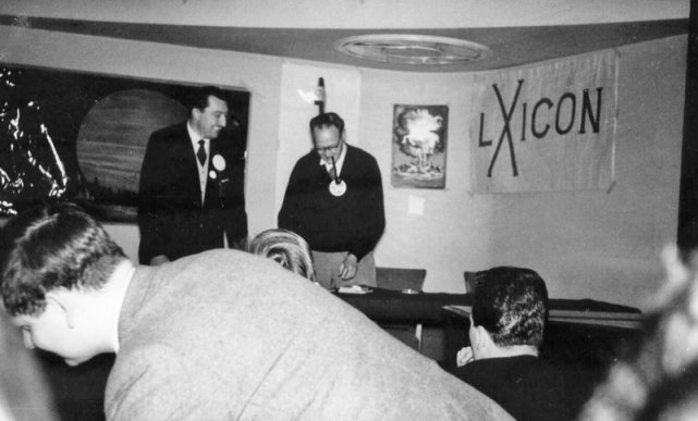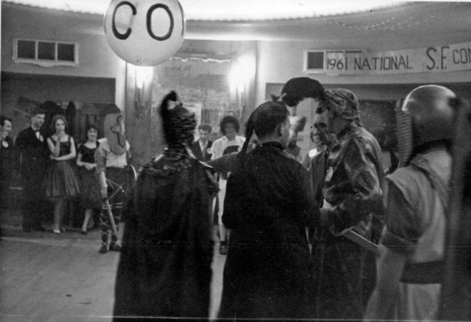 Arthur Thomson called them to order and got them started, a most fearsome sight that struck awe into the bystanders. Tubb, not having a shield made do with two swords. Had I not known he was quite friendly with his opponents, I would have sworn that he had his heart set on killing the lot of them. He would beat about one of them, whilst making frantic back handed swipes at any other opponent who passed within reach. Amis, who had managed to get a seat at the front, was cowering against the back of it. Bob Richardson, dressed in a sort of Mongol outfit, and Don made frenzied efforts to decapitate each other, right in front of Amis, and they didn't seem particularly worried about the possible loss of one of our leading writers.