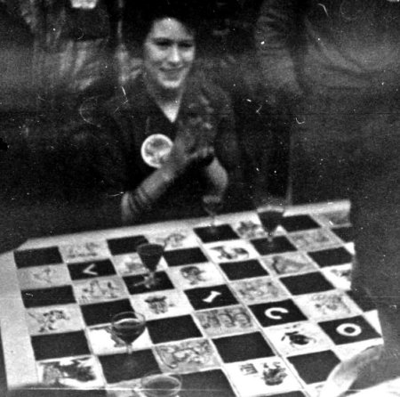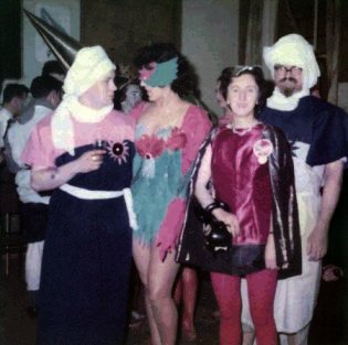 I regretted, as usual, that I hadn't been able to get to the convention on its first day, but as you've probably gathered from the opening paragraph, arriving at a convention in full swing has an impact all its own. Memories of the rather tedious journey soon faded once I got my bags parked in a room, and found out where the parties were being held that night. I'd met Ron Bennett in the con-hall and he came up with me to my room to hand over some cash he'd collected for TAFF, and to aquaint me with some of the happenings so far. He brought me a glass of Brown Ale, too, which helped nicely to start my re-orientation. I didn't waste any time on unpacking, the only items to be dug out of my bag were Camera and Pyjamas (in case I went to bed that night, you know !) My room was way out - so far out that it was probably the only room in the hotel in the Borough of Cheltenham! - but it didn't take me long to find a party. I'm not quite sure who's room it was in, but it was quite a Kettering-style affair with every inch of space, on, besides, and under the bed fully occupied. Using my flash as a weapon, and the camera as a ruse - " just move over to the left a little " - I managed to make my way from one side of it to the other. It was a single room and it took me about ten minutes to get across it, that will give you a good idea how many fans were in there.