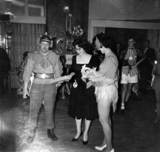 ELLA PARKER: Costumes ranged from the grotesque to the attractive with many in-betweens. Outstanding were the mask worn by Dave Kyle, the bird costume worn by Ina Shorrock (which won first prize in the parade) and that horrible eye worn the middle of her forehead worn by Ruth Kyle. Worth a very special mention in my opinion, was the witches outfit, complete with besom worn by Diane (Alan Rispin's friend), both for its simplicity and impressiveness; she really looked the part...if that isn’t being rude. Ted Tubb, Bruce Burn, Bob Hawkins, Brian Burgess, Bob Richardson, Pat Kearney and Don Geldart had brought out once more the armour, swords etc. that had been worn and used with such good effect when the London crowd visited Cheltenham at Whitsun two years ago. Dancing - or what I saw of it - was patchy, many of them preferring to stand at the bar drinking and forming discussion groups. I was off in a corner of the hall with Ken Slater, Dave Barber, Ian McAulay, Jim Groves and a couple of others talking about S-F. That was one thing about this Convention which caused much comment. No matter where you went or at what time of day or night you would come across a small group tucked away somewhere discussing S-F. Whether, as has been argued, this was due to the influence of the BSFA members present, or not, I wouldn’t like to say. I have noticed that even at our SFCL club meetings it is talked about a lot more than it was in the past. Maybe it's coming back into fashion or favour?