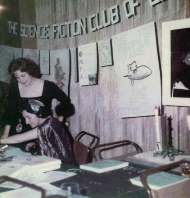 ERIC BENTCLIFFE: Arriving at a convention, a s-f fan convention, with Masquerade Ball in full swing, is rather like stepping into a surrealist picture. One moment you are travelling through dark, wet-shiny streets; at an hour when the streets are dead - the next you are surounded by Green-faced Ghouls, Spacemen of varying hue, and Fine Feathered Females. One moment you are registering at the desk of a discreetly lit hotel lobby, the next you are in a gay hall hung with esoteric slogans and embellished with alien phrases - and filled with a fine welcoming crowd of people. Someone pushes a glass into your hand....another convention has started.
