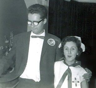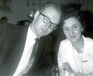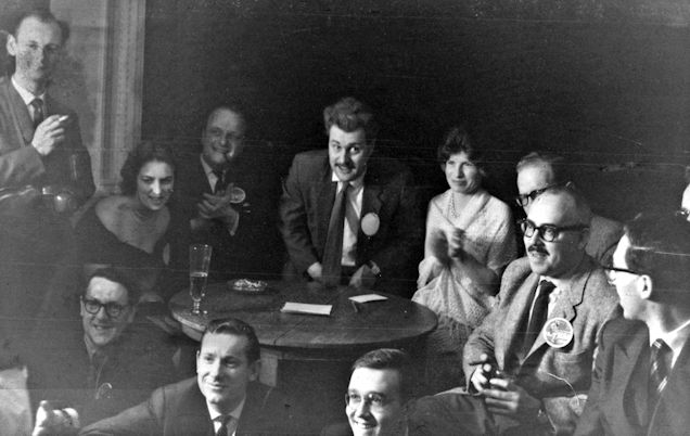 Ian: "Aldiss, what d'you mean having men with diode valves in their heads?" I can't remember exactly what Ian's reply was and, not wishing to give a false impression regarding his drinking, I have chosen to omit it. RON ELLIK: I was supposed to talk about MIT that afternoon, but things got a bit hectic in there when the speeches ran on towards dinner. Everybody wanted a break, and I was shuffled about to the next day, which didn't bother me a bit. During the afternoon sessions I met J. Michael Rosenblum, one of the nearly pre-historic British fans, sustainer of Britain's famous FUTURIAN WAR DIGEST throughout World War II when publishing fanzines was an almost impossible task. Mike is no longer the youngster described by Joe Gibson from a wartime meeting -- he is now a robust, cheerful businessman with a quiet, clear speaking voice and an interest in almost everything. More meetings: Brian Burgess of London, another towering giant, who reminded me of Bre'r Bar of the Joel C. Harris stories; Brian Aldiss, Hugo-award-winning Oxfordian who was helpful in my almost-meeting with Professor Tolkien; and -- surprise -- Eric and Beryl Bentcliffe, my hosts of two event-filled days earlier. Eric was wandering about with camera in hand, busy as a bird-dog and-happy to be actifanning again. It was pleasant to meet the Cheltenham crowd, too -- Eric Jones, with whom I used to correspond as early as 1952, and who turned out to be an alive, outgoing man and the sustaining prop of the Cheltenham SF Circle; Peter Mabey, the hard-working Librarian of the BSFA; and Audrey Eversfield, Bobbie and Bill Grey, and John Humphries. They made sure I was thoroughly invited to visit Cheltenham and somehow at about that point I found myself upstairs in the Clarendon losing a small fortune to John Roles and Ina Shorrock while Norman clucked at my eagerness for Brag. It wasn't until the next night (Sunday) that I began to win back my losings, a change at least partially due to that session in the Shorrocks' room, and Norman's comments about my playing. He has the most irritating manner of raising his eyebrows when I do something wrong -- a sure-fire teaching system. During the later afternoon I took advantage of a counter at one side of the assembly hall downstairs to set up with my camera taking fairly candid shots of many people intent on the programme. These shots with late afternoon lighting directly on the subjects were among my best -- particularly one of Mercer, full-face, looking rather startled as I call his name, snapping the shutter a breath later. Eventually the West Park inhabitants wound our way back to dinner; by this time Walt Willis had arrived from the airport, and I was privileged to meet him ahead of most other American fans by four months. He was tired and rushed from the hassle at the airport, and I don't recall him saying anything deathless that afternoon; as he and the other Irish fen were at the West Park, I saw much of them for the next day and a half, but as I was to visit Belfast the next weekend we naturally spent much of our time meeting others. The Irish boys are nearly as unfamiliar with English fandom as I am because they have attended very few conventions: Walt has been to two conventions in America, for example, and only three in the U.K. (Not so. Willis was at cons in England in 1951,1952,1953,1956, 1957 - Rob.) John Berry is an even wilder example -- he has never attended a British con, and the only ones who have met him are those fen who've visited Belfast; but he's an extreme, and Walt, James and Ian certainly knew their way about.