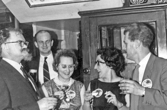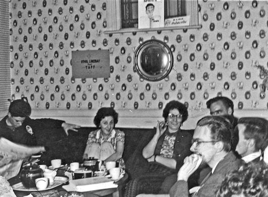 Ethel, Ian, Walt, Ron Ellik, George Locke and myself were on Ethel's bed - - the party had begun to thin out by that time -- discussing