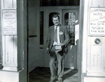 In this incident I learned the meaning of geyser -- it's a small, wall-mounted water heater, gas-operated. This was what had been on the wall above the sink at the Bentcliffe home, but it was metal and I didn't understand its use; it must have held at least three imperial quarts, while the West Park's geyser held perhaps one, to be used for single pots of tea or to infuriate Ron Bennett. And so we mopped up, and Norman started the just-full geyser heating, and Liz helped Sid fix tea and coffee. As I was carrying my fourth tin of water from the room, I noticed the water beginning to bubble, and pointed it out to Ron. "Don't pay any attention to the dirty little thing," he snapped. "You have to wait until that little red light goes out." And, since he has one just like it at home, I took his word for it. On my next trip with a tin of water, as we were getting the last of it off the floor, I mentioned to Ron that the water was coming to a gentle, rolling boil. "When that light goes off," he said, "the water is ready. It has a thermostat which clicks the light off at just the right time." He was still shaking from his hysterics about shutting the thing off, so I made another trip. As I re-entered the kitchen, I saw steam rising from the far wall and boiling water spurting out the top of the geyser; nobody else was paying it any attention. "Ron!" I shouted, "the geyser is boiling!' He looked at me as if I had not a brain left. "That red light --" he began, and turned to look at it. "Oh, my ghod!" he screamed, suddenly hysterical again, "that light must mean it's finished heating!" And with a cry of "But I have one like it at home!" he leaped across Dave Barber and grappled once more with it -- only this time every control was being doused with scalding water, and it took a seeming eternity to get it under control. He had no help this time, because one and all we stood gasping for breath, holding our aching ribs and nearly collapsing with laughter. And of course we had to mop up again, but Bennett and I had to go to the lavatory about this time. When we returned, nearly recovered, the group was put into fresh paroxysms of hilarity by Sid Birchby, who unthinkingly picked up an unusual spoon, with half the bowl missing for some reason, and attempted to spoon instant coffee with it. He stood there inanely with coffee spilling out of his utensil, while we stared, and pointed, and laughed. From then on to dawn, someone might say spoon, or water, or geyser, or "I have one just like it at home," to find gales of laughter. At dawn the Irish boys descended from a party in Ella and Ethel's room which had lasted the night, and we told them the story. JAMES WHITE: Ron Bennett stopped long enough to reassure us that the slight dampness in the kitchen was nothing to worry about and that the boiler had been unco-operative the first few times he had handled it, but now it knew who was boss. He also said he knew where there was some instant coffee and offered us boiling water prepared personally by the hands of the Convention Chairman. While we were drinking this glorious, warm stuff, Ron Ellik gave us the details of how the other Ron had tamed the boiler. Not wanting to steal his thunder -- boilers make an explosive, hissing noise when they blow up in any case -- and in an effort to avoid puns with "highest steam" in them, I will not repeat them. Ron went back to his brag and we began debating whether or not we should go to bed, deciding finally that we were all too hungry to sleep. Walt, Ian, the fan who climbs drainpipes and compares me with Hal Clement, and myself were beginning to brood about the injustices of the world and society in general, our thoughts being strictly from hunger. Then Ian, Walt, and the drainpipe-climber from Oxford left me in a last desperate attempt to find food....and stumbled on an unlocked refrigerator. After we had made a large dent in the contents of the refrigerator and left some conscience money behind to cover the cost, we all felt more like ourselves. But still we were not completely happy. Possibly it was a sense of loneliness that ailed us, because we had been used to large crowds of people and now we were only four. The fans playing brag at the table a few yards away were in another world, and didn't count. It didn't feel right being able to talk without raising one's voice, or walk from one end of a room to the other without saying "Excuse me" six times. In any case someone, possibly me, suggested that we wake up Harry Harrison or Brian Aldiss and somebody, me again, thought it was a good idea. We batted it about for a while, discovering that we weren't sure of Harry's room number and that there would be an element of risk attached to waking the Harrison up, and that we had a rough idea where Brian's room was and that he was the type who was invariably polite. It was 6.45 when we left for the other hotel to wake up Brian. His hotel was locked but there was a drainpipe which led past a half-open window which, according to our calculations, opened into Brian's room. The fan who compared me with Hal Clement said that he climbed drainpipes all the time at Oxford and started to scale this one. But drainpipes in Harrogate are made of softer stuff than in Oxford and it began to wobble alarmingly, so he came down without accomplishing his mission. Which was perhaps as well, since we were told later that it had been Margaret Manson's room. Gradually we became resigned to the fact that we would be unable to wake anyone to join our party and we headed back to our own hotel to freshen up before breakfast. The sun was still shining down warmly and the sky, trees and grass had a newly minted look. I think we were all feeling a little poetic and philosophical about things, because it was suddenly borne upon us that when we had gone into the West Park Hotel to see 'A Matter of Life and Death' the local meteorological phenomena had been identical with the conditions around us now. It ma