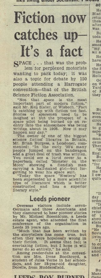 JAMES WHITE: After breakfast we returned to the two Con hotels and spent the morning waking people up and saying goodbye. Our train did not leave until mid-afternoon and so I was able to watch the convention dissolving around me -- the Gerfans piling into their station wagon and driving off; Ken Slater, his wife, portable bookshop and lovely little daughter pulling away in their van; and the others who staggered away with suitcases so loaded with auction material that toothbrushes were carried in the breast pocket. There seemed to be a lot left unsaid to an awful lot of people and I expected to feel sad at coming to the end of such a wonderful convention, but somehow I didn't. Then we all lunched with Ethel and Ella, who also left us to the train where we were joined by the Bentcliffes, and sat talking in the sunshine outside the station for a long time. Ethel said "See you in Peterborough, James" and Ella was rude to us all again, but even I could see that her heart wasn't in it. All this time I was still half convinced that it was yesterday afternoon and wholly convinced that it had been the nicest afternoon I had ever known. And so it was, when the train entered one of the long tunnels on the other side of Leeds with a roar that woke me suddenly to pitch blackness, that I reached across to touch Ian and Walt and yell that Sunday night had caught up with us. Symbolically, and rather dramatically, the Long Afternoon of Harrogate had come to an end.