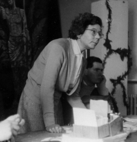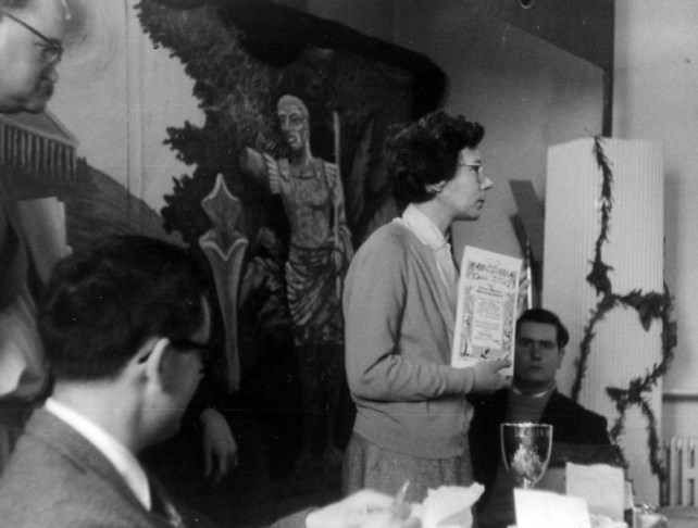 The meeting was, in effect, chaired jointly by Ken Slater and Bobbie Gray - Ken because he was this year's Con Chairman, and Bobbie because she'd been conducting the BSFA business meeting. It started half an hour later than scheduled (people were eating) and gradually snowballed as more and more fans crowded into the little lounge, many of them quitting 'Orphee' (which, though I didn't see any of it myself, I understand called for considerable devotion to fandom on the part of those leaving it) in order to be in on the deliberations. And we argued and we argued and we argued. We argued round in circles, in fact. Somebody would say something, suggest somebody's name perhaps, or ask a question. The suggestee would decline "on the grounds that...", or the question would be answered, Ken or Bobbie would complete the circular argument and start again in the same place as before. More suggestions. More regretful refusals. More questions. And somehow the shape of the circle would subtly shift, as Ken (or Bobbie) started the argument again - from (if it were possible) a slightly different side of the same place. And suddenly the circle was broken. Some subtle shift in the formula some illumination sparked by a casual but pointed interjection from somebody, had left open a way out of the circle. And Tony Walsh - may much egoboo accrue to his name - had agreed to accept the job. If he hadn't, I think we could easily have been there all night. I understand they elect Popes the same way. But I'm damned if I can remember a word that was said - or by who. RON BENNETT: At an extra-ordinary business meeting on the Sunday evening in the Wakeford Lounge a goodly proportion of the attendees gathered to discuss plans for holding next year's convention in Peterborough. Ken Slater pointed out that he could not afford the time away from his business to put on next year's convention but was willing to take charge of professional displays. George Locke said that he would be willing to produce the convention's newsletters and Ken Slater said that he would also be willing to look after the hotel bookings. At the end of the meeting Ethel Lindsay staggered out to find herself in charge of the 1964 programme. She was supported (yes, held up) by Tony Walsh who looked shaken himself - he will wake up to find himself Convention Chairman, Secretary and Treasurer, a formidable combination. Peter West offered to provide and put on the films and is asking anyone to suggest titles of both professional and/or amateur SF films they would like to see next year. How about The Trouble With Harry, Peter? BRIAN VARLEY: After the film, which finished shortly after midnight, there was a small gathering in 258. A dozen or so fans spread comfortably over chairs, beds or floor, a drink in hand, good conversation and a pleasant atmosphere made it a joy to be there. We learnt the Aldiss method for finding plots and this is now available to aspiring writers, price ten shillings, and will be forwarded under a plain brown cover. We would also like to offer Mack Reynold's method but he was too busy trying to persuade someone to play with his toes. Tom Boardman was holding forth on the publishing life in general and the peculiar habits of certain writers in particular. John Brunner was holding forth... Altogether a very pleasant evening and a most enjoyable end to the convention. There is an opinion, widely held, that all parties should be open to all comers, and there is much to be said for the spirit behind this. Personally though I can only truly enjoy a party if there is room to breathe and move in. I attended both parties in 258 and must say that the Sunday evening "closed" session was infinitely more preferable... but then I am speaking from the inside. BRIAN ALDISS: And so the Sunday wore delectably on. Kingsley returned to Cambridge by taxi, most of the rest of us - and that makes about 169 - saw one or both of the two films, "Metropolis", and Cocteau's "Orphee". The latter has most powerful symbols of death and the unknown, but the former was the more popular; in the immortal words of Skyrack, "There were many impromptu remarks from the audience". So the gaiety went on unabated. When Tom and Joyce Boardman dragged Margaret goggle-eyed from "Metropolis", we went and had a drink in the notorious Room Five, where the Brunner's massive dog was just finishing the remains of a delicious fan. Serious discussions then took place, on the subject of whether world conditions had not seriously deteriorated since women were given the vote. On the bed John Brunner and Bruce were entertaining Margaret and Joan Harrison with the exploits of Feghoot. I sold one of my oil paintings to Bruce for an undisclosed sum. Eric Bentcliffe suggested that since people got tired, all-night parties should in future be held during the afternoon.