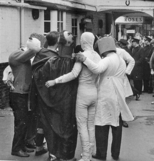 That's Charles Partington in the striped costume, probably Harry Nedler in the bughead costume with long robe and claw hand, and either Tom Holt or Tony Edwards as the Mummy. All photos are by Terry Jeeves: