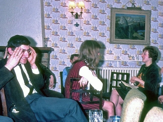 After the party, probably the most successful social occasion during the whole Convention, cliques gathered in the downstair-lounge, parties started in various rooms, drunkards roamed the corridors, rooms were broken into by a phantom inebriate with a master key. The white glare of flashbulbs successfully blinded several fans. While neofen grumbled morosely about the lack of organisation and the lack of sf interest in older fans, the older ones smoked pipes and played cards on the landing and in the lounge. Michael Moorcock assisted as always by his London group of hangers-on, spent the evening crooning and bellowing into a microphone, revising the bible, climbing over the roofs, and generally making a nuisance of himself.
