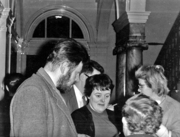 Friday 16th April(early programme | late programme)ARCHIE MERCER: "I told you the stairs would be quicker..." The Convention really started for me some time between 10 and 11.a.m. on the Friday, when a large vehicle known to its friends as TAK.10 was perceived approaching from the right. This wagon, veteran of several earlier Conventions, was being driven at the time by Simone Walsh. It also contained the persons of Tony Walsh, Sarah Walsh (a maiden of as yet somewhat tender years), and John Berry. Not, of course, the Belfast John Berry. Inasmuch as the latter is himself a Brummie, there was, naturally, not the remotest chance of his attending a Brumcon. The TAK.10 J.B. is from Somerset, and should therefore be dubbed J. Somerset Berry. TAK.10 delivered its cargo at the Midland Hotel not long after mid-day. Having registered, the components of said cargo collected Doreen Parker and a couple of other bodies and went to eat. There were eight persons all told, not counting Sarah, so naturally they wore allotted tables for two. This gave me the opportunity for an intimate tête-à-tête with Doreen; after the meal, I sought to prolong this pleasant experience by accompanying Doreen to Redditch to collect Beryl. Alas for his hopes - Ted Tubb came too. In fact, Ted drove, as Doreen was not feeling very well. About a week earlier, she'd had an accident resulting in some nasty bruises. (She swears that nobody will ever believe that although she's had four accidents in that incredible car, every time she's been stationary). In addition to that, she'd had an anti-tetanus injection that had gone wrong, leaving her with a very sore arm and an upset tum. Once in Redditch Doreen was able to give directions, and piloted her car skilfully round The Fearnings to No. 59. At that point the Convention really started for Beryl.