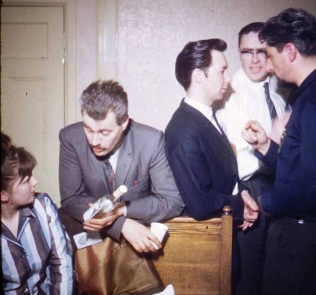 At about midnight, the hotel was strangely quiet, the 'Aliens' having mysteriously disappeared some time earlier. An hour later, its peace was shattered by the thunder of Mancunian feet, as said 'Aliens' galloped around the place, distributing copies of a leaflet which had (so it announced) been produced in a local garage, and which purported to describe the events of the Con's first day. (This appears to have been the first convention newsletter ever produced at a UK con. It can be found here.) It may have been later that same evening (or it may have been on Saturday, but no matter) that a perfectly innocent remark made by Simone led to a heated, though happy political argument between Tony and Phil. Everyone else had long since left the Back Bar, the waiters were switching off lights and issuing martyred Looks free of charge, but Tony and Phil were having far too good a time to worry about that.