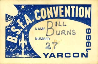 More of Bill Burns's UK con badges here Report below edited together from those written by the individuals noted. Comments inserted by me appear in parentheses or are italicised, or both. Source notes and links to complete, unedited versions of those reports can be found here. The photos presented herein come from a variety of collections, though this doesn't mean a particular picture was taken by that person. The collection photos are from, where known, is noted in parentheses thus: (ns) Norman Shorrock, (sn) Stan Nicholls, (pm) Peter Mabey, (kf) Keith Freeman, (ks) Ken Slater, (te) Tony Edwards, (dk) Dave Kyle, (tj) Terry Jeeves. As always, a tip of the hat to Peter Weston for identifying many of the people in these photos and for supplying them in the first place. Here are links to pages devoted to the individual days and to convention literature.