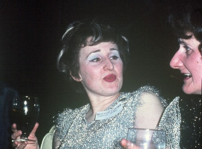 After our meal we wandered back to the George and flopped, replete, in the Devil's Kitchen, where we found that Dave and Maureen Barber had arrived for a flying visit with their baby, Sara, just two weeks old. Some time later Doreen reminded Daphne that the latter had promised to 'do' the former's hair ready for the evening's banquet. We all trooped up to Daphne-and-Jean's room to witness the doing of Doreen's hair, and to lower the level of a couple of bottles in the girls' wardrobe. Ted Tubb and Ken Bulmer also joined this domestic little party. We sat around on the beds and the chairs and the floor, drinking and yarning in the hallowed manner of all room parties, and finally it was time to go and get ready for the banquet.