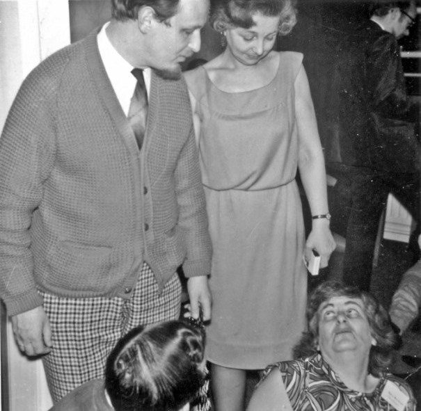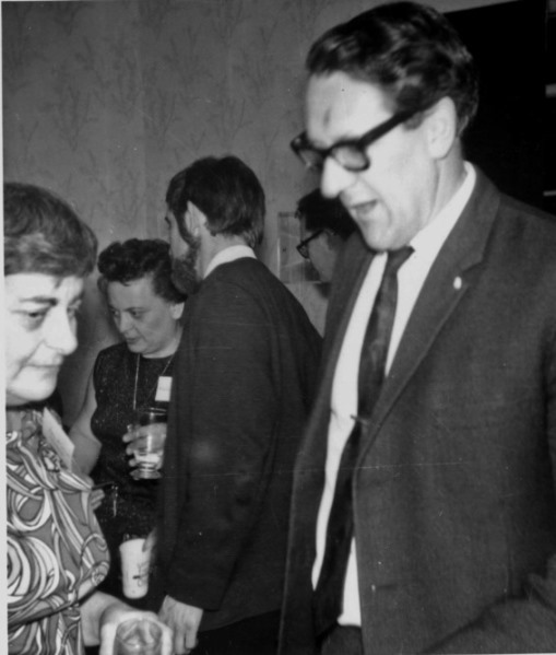Ordinary inhabitants of Bristol began to arrive in the convention hall after dinner, for the hotel management had organised its customary Saturday evening dance. Some of the braver fannish souls (he says, with considerable pride) ventured out on to the floor for a quick waltz or quickstep or whatever. Because the hotel had refused to cancel their regular Saturday-evening dinner dance this meant there was no Fancy Dress parade. Instead Tony Walsh moved everyone to a basement under the main hall for a cider-and-sherry party, although almost everybody was drinking beer. ETHEL LINDSAY: In the evening the convention committee threw a sherry party (Bristol is the home of sherry) at which Tom Schlück showed films taken on his TAFF-trip to the US. PETER WESTON: It was here that I became mixed up with Tony Walsh, Frank Herbert and Jim Marshall for a rather dirty little session during which my "brown paper parcel" story prompted a very gratifying reaction.