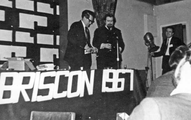 MERVYN BARRETT: The British Fantasy Awards were handed out that afternoon. Philip K. Dick's THREE STIGMATA OF PALMER ELDRITCH got one, and Mike Moorcock got one for his valiant efforts on behalf of sf in keeping the NEW WORLDS flag flying. Then they introduced the Guest of Honour, John Brunner. John sat and gave a lucid, carefully prepared, two part talk. The first part of it - given while I was still making some, feeble attempts at note taking - was concerned with the unauthorized and unpardonable mucking around with the words of writers that some American publishers indulge in. He cited one of his own books THE PRODUCTIONS OF TIME, which had really been given the treatment (I forget if it was fifty alterations in the first page or the first chapter but anyway it was a hell of a lot) and suggested that his readers wait and buy the Penguin edition. The second part of his talk dealt with the idea that an awful lot of writers seem to be rather 19th-century in their choice of story themes, and not really aware of the possibilities of story lines that can be developed out of the immediate future. I think... I do remember (such is my talent for concerning myself with trivia while failing to grasp the important points) that at two or three well-timed intervals in his talk he threw in a "shit" metaphor to make sure we'd keep paying attention, but he needn't have bothered: his material was so well organized and presented that he had his audience with him all the way.