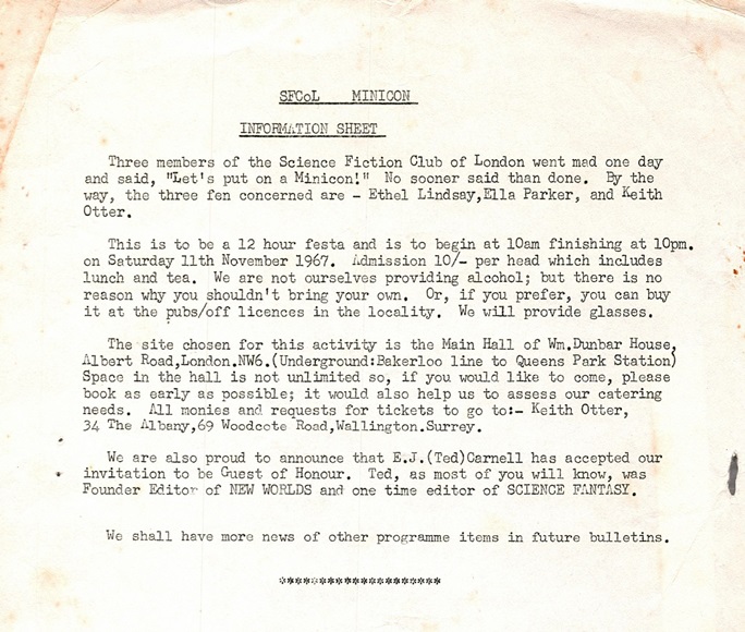 Ella Parker turned up at a Globe meeting in London early in 1958 and was soon in the thick of things. Arguably the most important fan of the decade that followed it's almost impossible to imagine that period without her. Her council flat on Canterbury Road, West Kilburn - the 'Parker Penitentiary' - hosted meetings of SFCoL (the SF Club of London) from March 1960 and 'Friday Night at Ella's' from August that same year.
