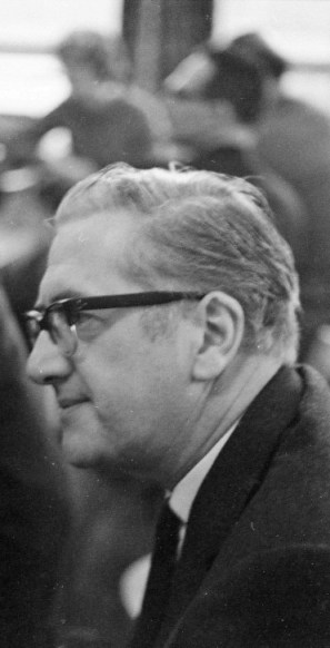 After lunch the audience had increased in numbers and exuberance and Ted Carnell, the Guest of Honour, had a rougher passage through his speech, which gave a review of SF publishing & selling. Lots of interesting facts about developments in Europe, the effect on sales during credit squeeze, American publishers expecting the film 2001 (Premiere next Easter) to trigger a boom in SF, etc. Background noise provided mainly by Arthur Sellings.