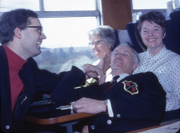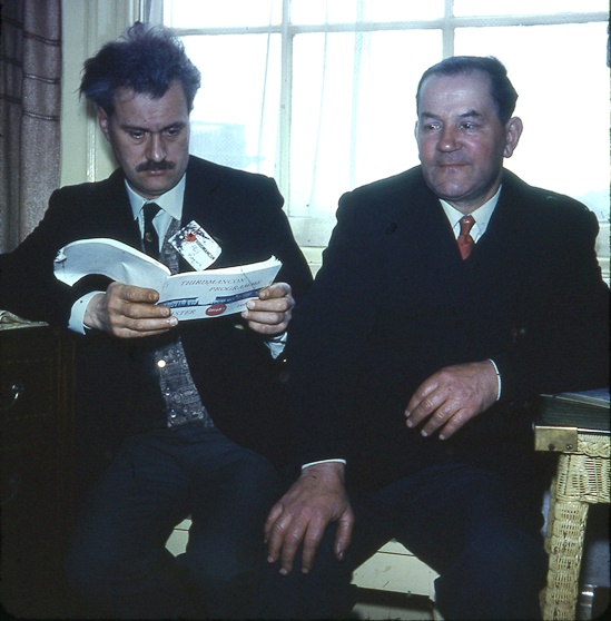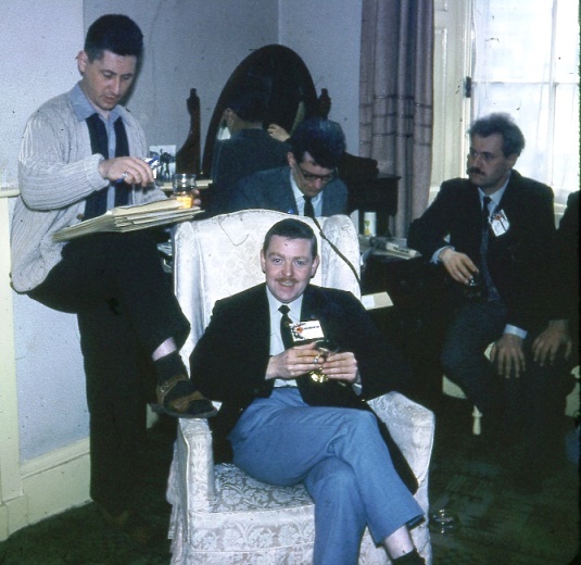 "I travelled up in Archie Mercer's car with the other BaD people," said Peter. "For some in my age-group this was the time of bells, beads and caftans; my vaguely hippy outfit was a Yugoslav pillbox-&-tassel hat (a gift from a holiday), and a sort of red, Chinese-dragon-print cotton top which was indeed a pyjama top (the accompanying bottoms, which I didn't wear, were black, giving a vaguely Mandarin look). I don't recall what trousers I wore, but probably flairs and maybe even 'loons.' To be fair, I was a teenager and it was 1968..." Actually, it must have taken a lot of courage to appear in this get-up in the middle of the afternoon. Most of us just wore our normal working clothes at a convention - that is, sports-jackets, suits, or blazers, complete with collar and tie-what else? Although some youngsters had turned up dressed a bit more casually, some even wearing jeans.