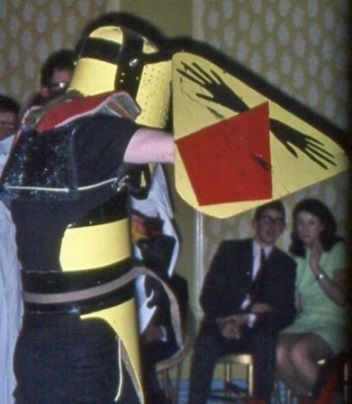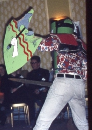 Back in the Con hall the Fancy Dress Party was getting under way, with an average of three photographers for every competitor. Brian Burgess should have won the special prize for his impressive suit of armour - which made him look about twelve feet tall - instead of the imaginative but simple plastic Black Cloud worn by Tony Walsh. Later, Brian's armour proved itself in battle when he and Ted Tubb featured - actually their features were steaming gently inside their helmets - in the Grand Jousting Tourney, during which they broke two shields and three swords trying to prove that the other one's armour could not take it. The welkin rang with the clatter of sword against hardboard and blood ran freely from skinned knuckles, but there was no clear decision, so they raised their visors and called it a knight.