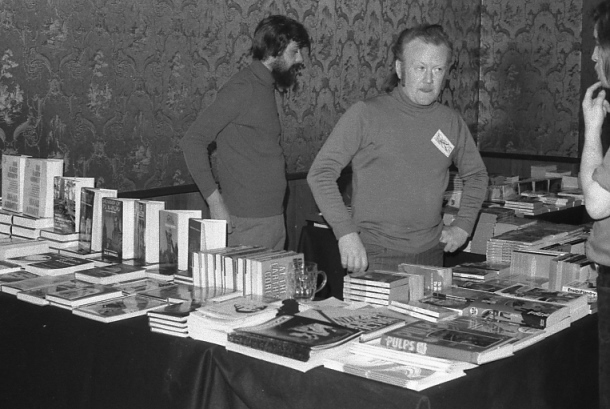 The "Doc Weir Award" was presented to Ethel Lindsay by the previous holder, Jill Adams. The British Sf Award was not presented this year due to popular apathy. Bruce Pelz, the only US voter through the UK TAFF agent Eddie Jones, received the prize of an Eddie painting after his number was picked out of a hat by June Moffatt in the TAFF lottery. Terry Jeeves won the Delta Amateur Film Award for a cartoon of his shown in the competition at the con. The British Fantasy Society's "Derleth Awards" (presented by John Ramsey Campbell who rose and promptly fell under the table!) went to 'Tales From The Crypt' (film), 'Conan' (comic), a de Camp short story (title someone?), Mike Moorcock's 'King of the Swords' (novel), and a special award to the publisher of Howard's 'Marches of Valhalla'.